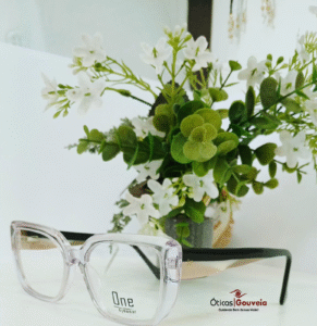 Acetato total, frontal transparente e hastes com preto superior e nude inferior.