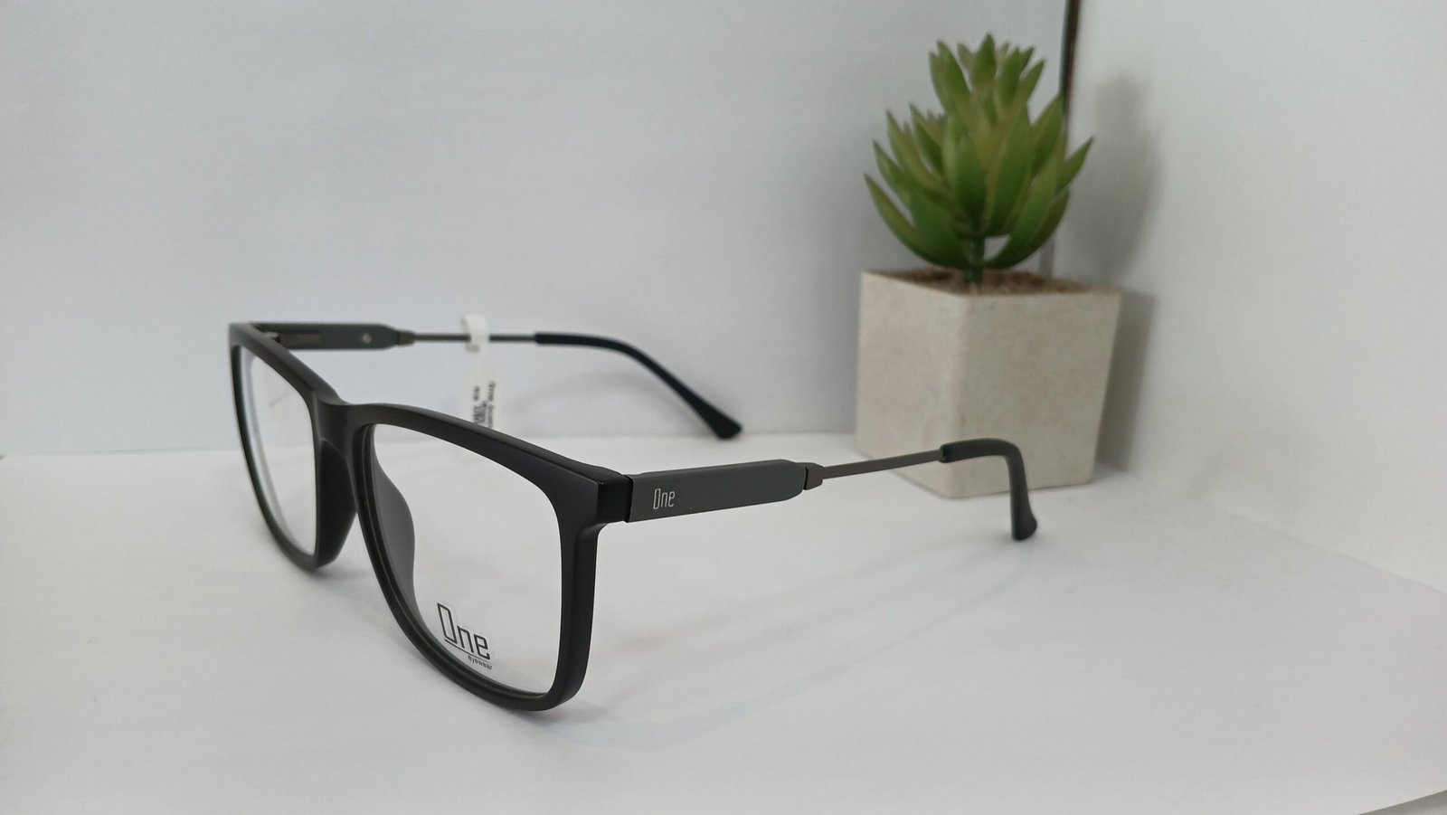 Armação para lentes de grau One, com a frente em acetato e hastes com um detalhe em metal, na cor preta e um detalhe cinza nas hastes. Modelo quadrado e muito confortável com amplo campo de visão.
