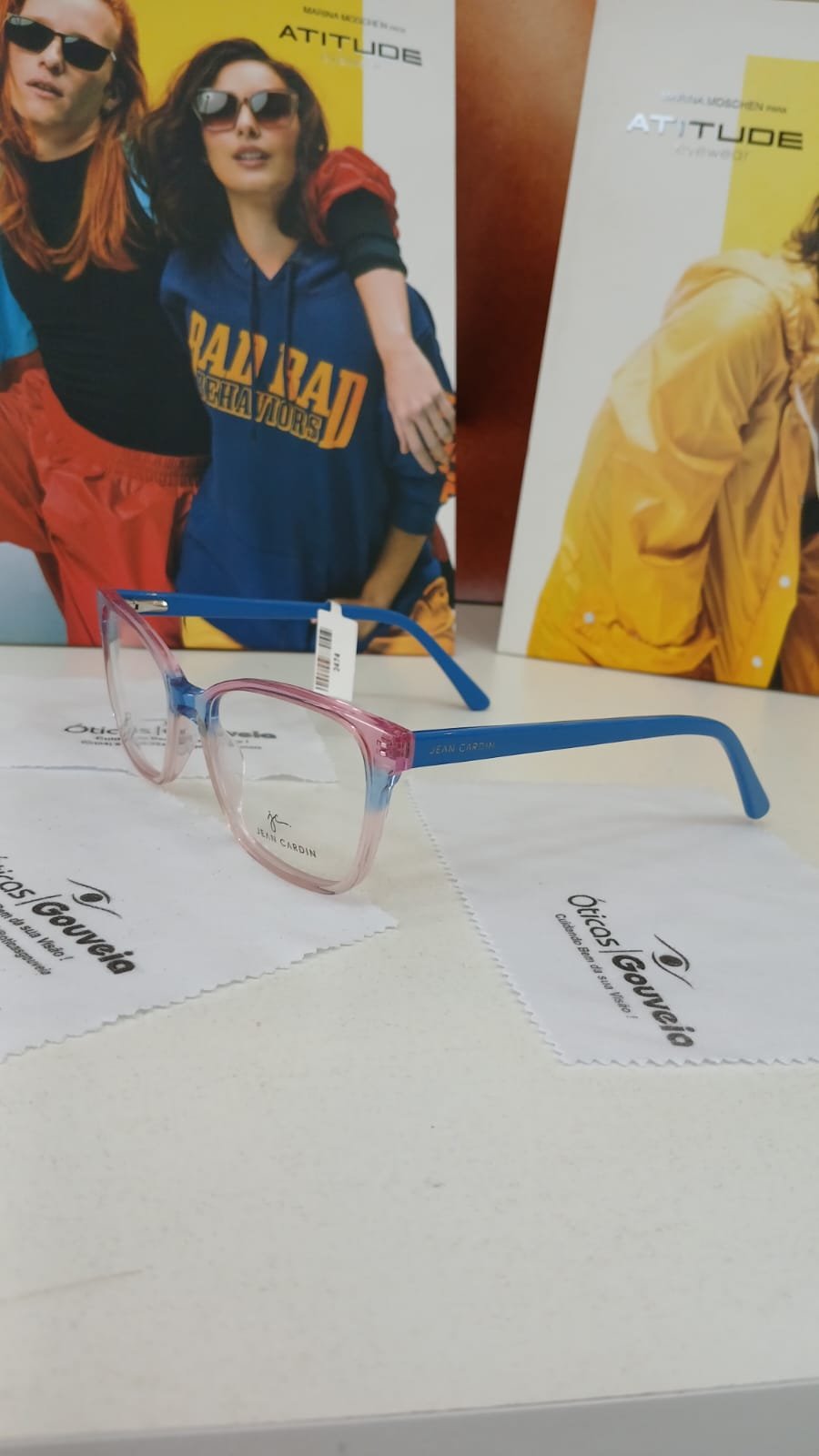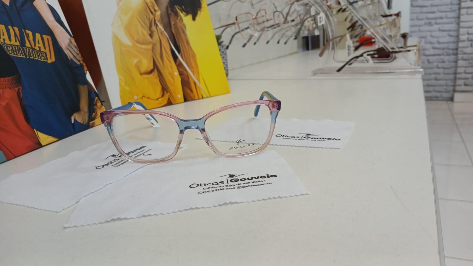 Armação para lentes de grau Jean Cardin, com a frente translúcida e um degradê rosa e azul, astes também na cor azul, toda em acetato.