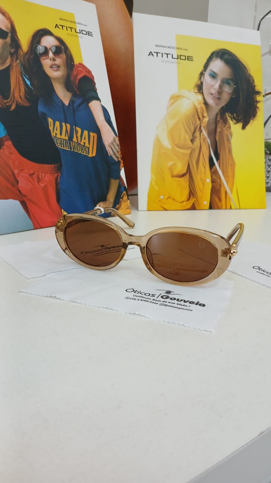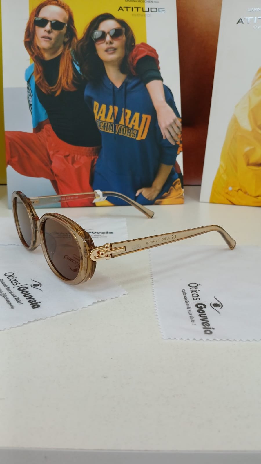 Óculos de sol estilo retrô Gou, arredondado, todo em acetato na cor marrom, translúcido, com lentes também na cor marrom, com pequenos detalhes dourados nas astes.